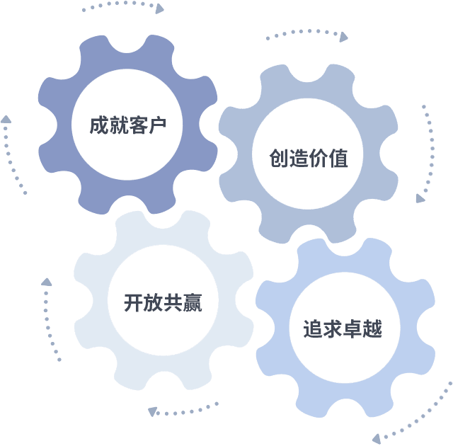 成就客户是一切决策的出发点,,,,创造价值是衡量所有工作的标准,,追求卓越是我们做事做人的态度,,,开放共赢是我们的格局也是最终的结果。。。。价值观的齿轮环环相扣,,,,推动着组织里的每个人不断向前。。。