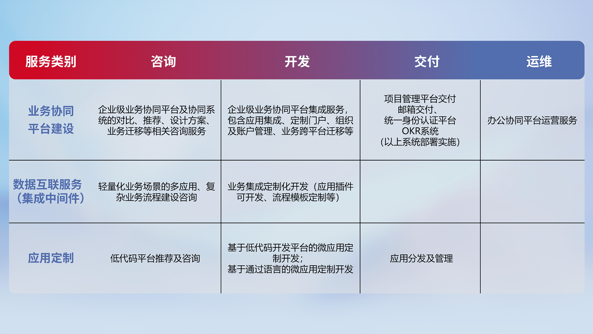 针对钉钉、、、、企微、、、IDaas等平台级产品提供产品的规划、、方案、、交付、、、、定制化开发等服务,,,实现如统一协同办公、、、、智能客户服务、、、、混合会议管理、、、智能数据查询、、、等业务场景,,实现数字化转型。。