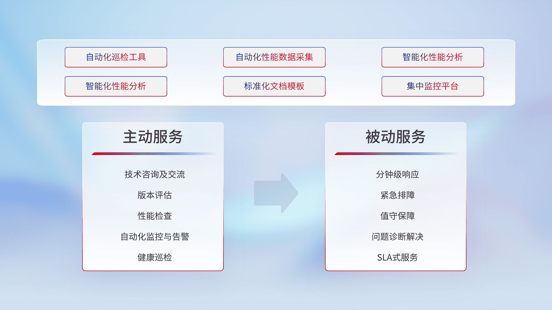 智能化工具和标准化文档,,保障服务质量,,,,提供主动服务(包含技术咨询、、、、版本评估、、性能检查、、自动化监控与告警、、健康巡检)和被动服务包含(分钟级响应、、紧急排障、、值守保障、、问题诊断解决、、、SLA服务)。。
