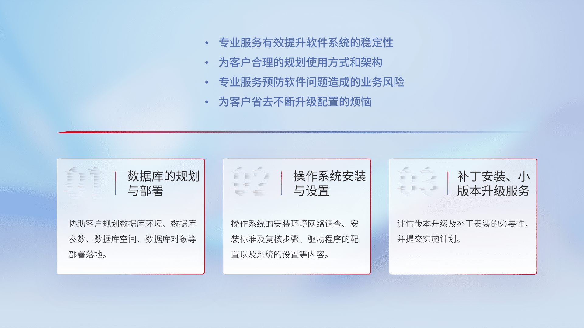 为客户提供软件规模升级、、、快速部署、、按需配置的专业服务,,,从数据库的规划与部署到操作系统的安装与设置,,再到补丁安装和小版本升级提供支持。。。。