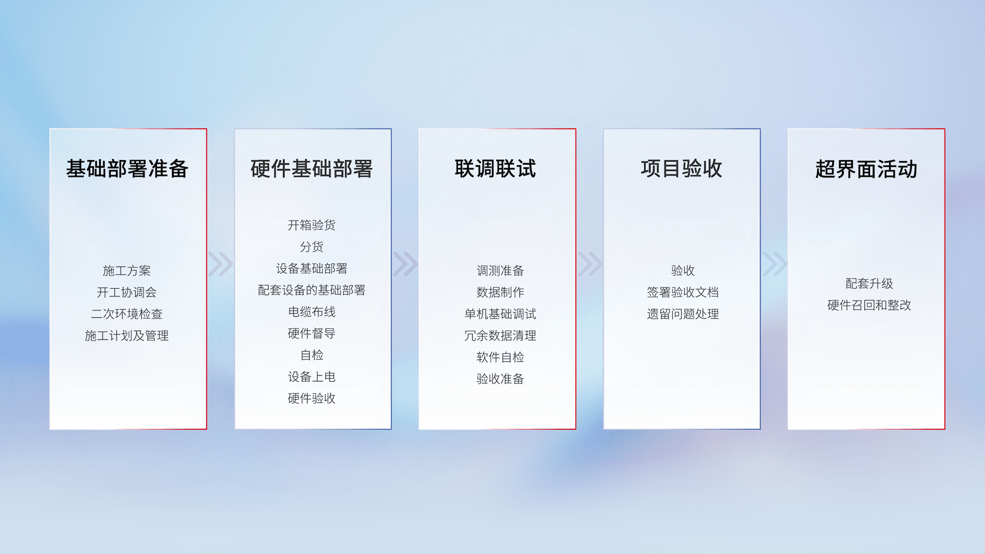 从基础部署准备、、、硬件基础部署、、、、联调联试、、项目验收、、、、越界面活动的全过程可追溯,,保证施工质量和进度。。。。